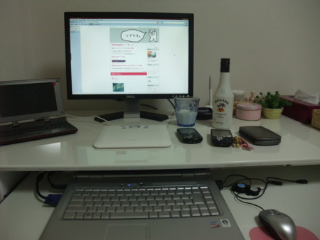その辺のホームセンターにて、適当なの買ってきましたー。 机は120cm幅で、スライドするところ(何て名前か不明w)があるやつです。 ダ...